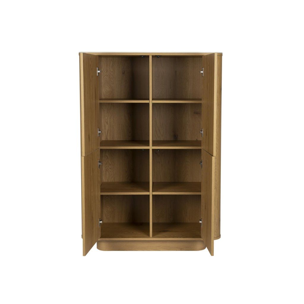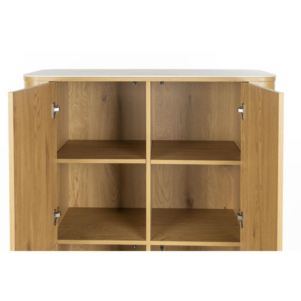 Díky chytrému vnitřnímu uspořádání nabízí komoda dostatek úložného prostoru pro každodenní potřeby. Vnitřní police umožňují přehledné uložení nádobí, dokumentů, dekorací nebo textilií, takže váš interiér zůstane vždy organizovaný a upravený.