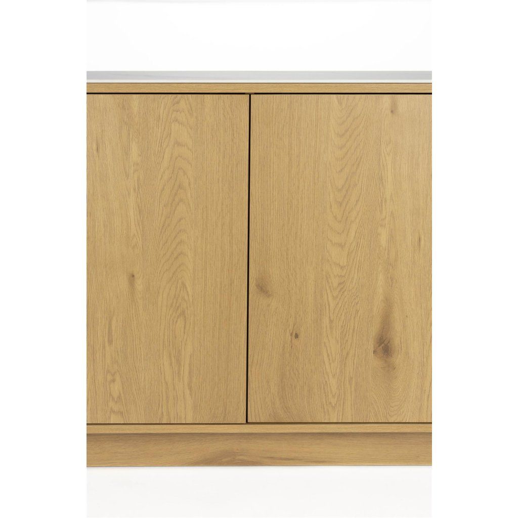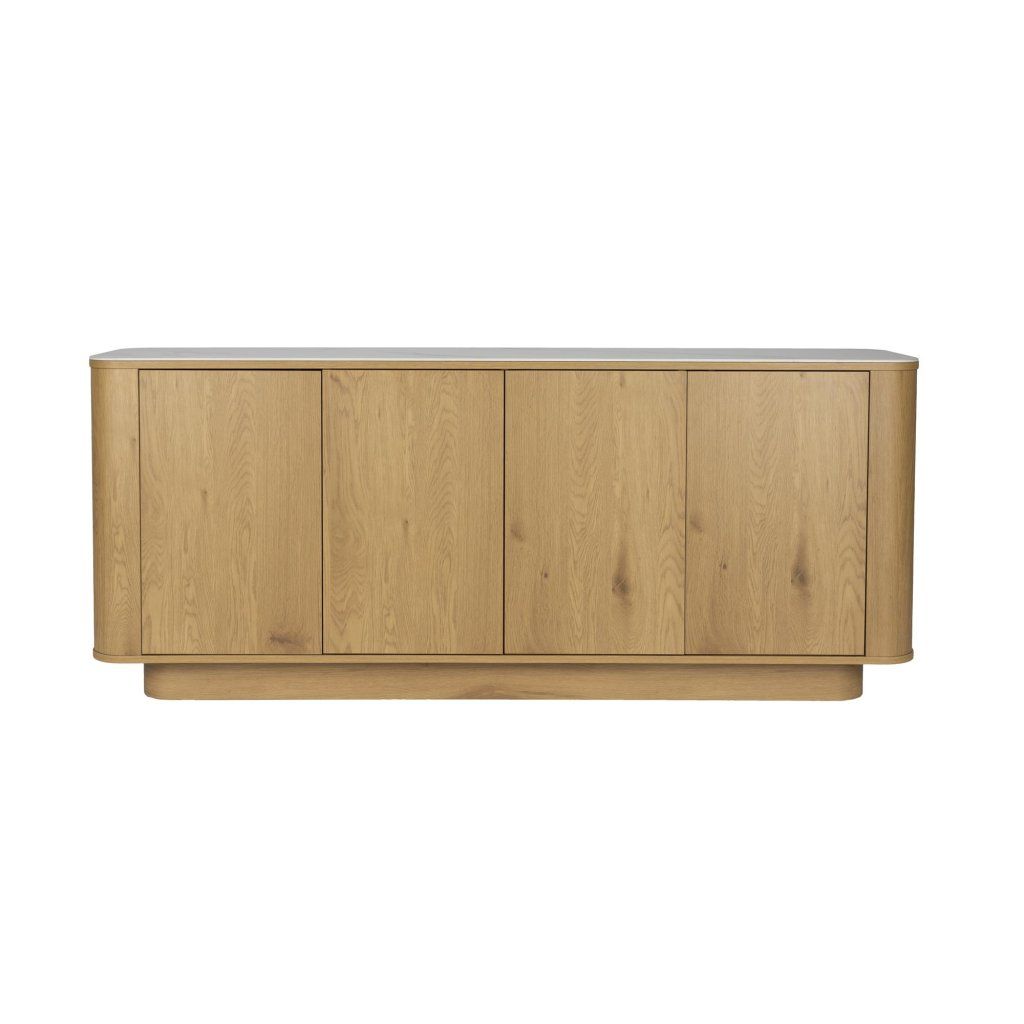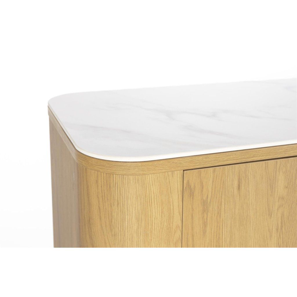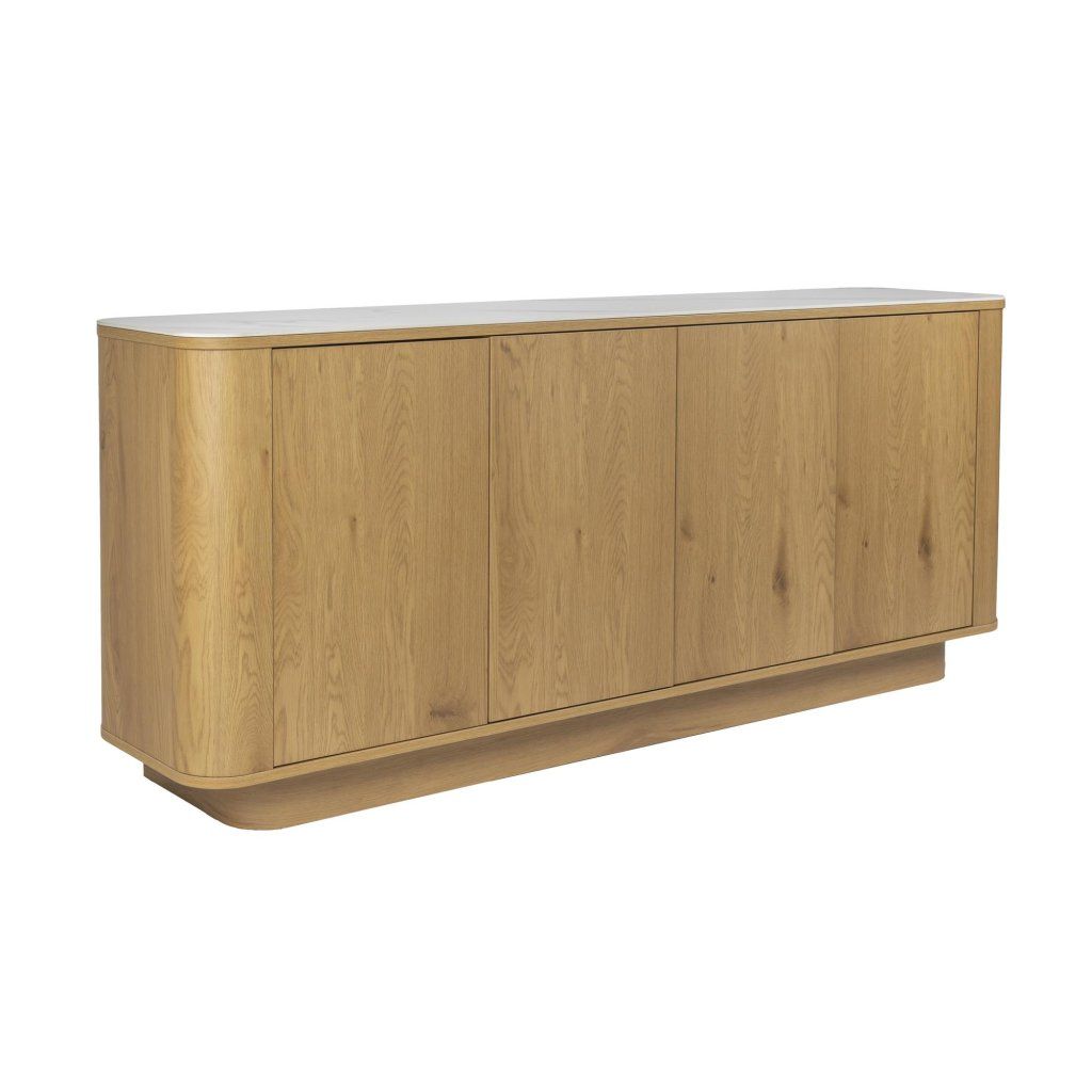 Přírodní odstín zdůrazňuje kresbu dřeva a dodává prostoru útulnou atmosféru. Horní deska v mramorovém dekoru působí lehce a luxusně, čímž celý kus nábytku získává jedinečný charakter.