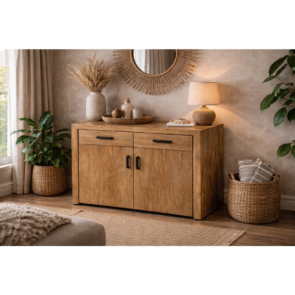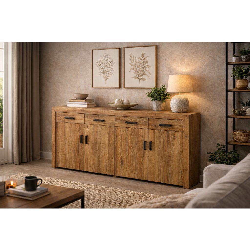 Masivní konstrukce je precizně opracována tak, aby vynikla přirozená kresba dřeva a zároveň byla zachována vysoká odolnost při každodenním používání. Komoda je pevná, stabilní a připravená sloužit po mnoho let.