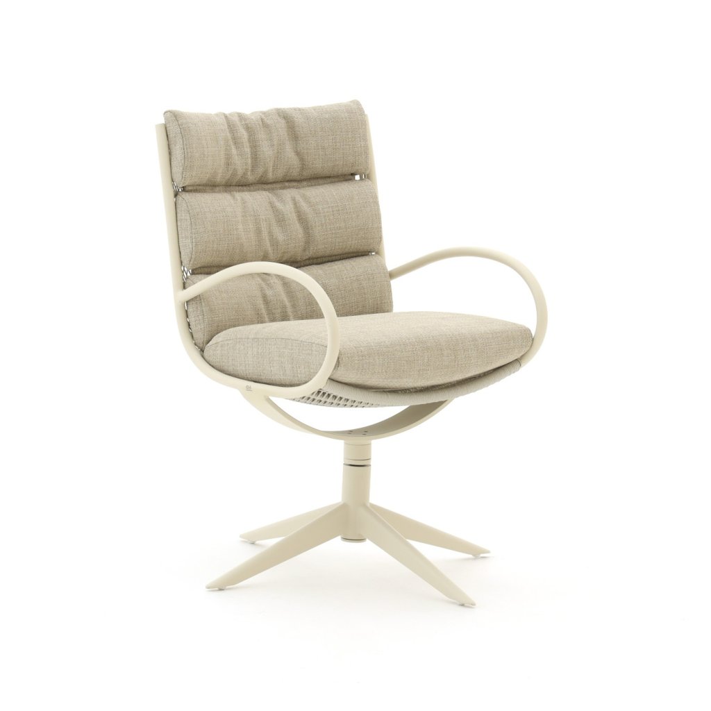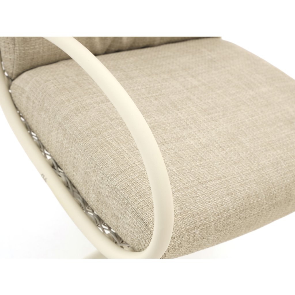Součástí židle jsou pohodlné polštáře Bee Wett®, které jsou navrženy pro venkovní použití. Materiál rychle schne, odolává vlhkosti a poskytuje vysoký komfort i při delším sezení. Polštáře v odstínu Cotton Flower podtrhují celkový světlý a elegantní vzhled židle.