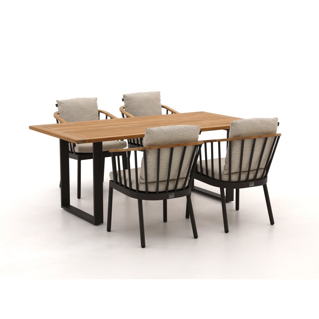 Základ tvoří robustní konstrukce z matně černého, práškově lakovaného hliníku, která dodává celému setu výrazný vzhled a zároveň zajišťuje výjimečnou stabilitu. V kombinaci s přírodním teakovým dřevem, které se objevuje na stolové desce a područkách židlí, vzniká vizuálně atraktivní kontrast mezi moderní tvrdostí kovu a přirozeným teplem dřeva.