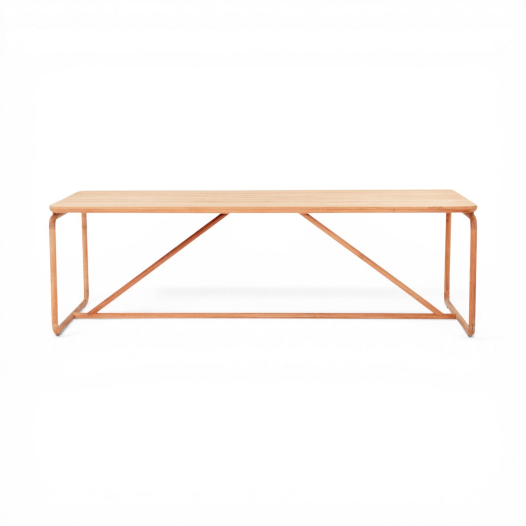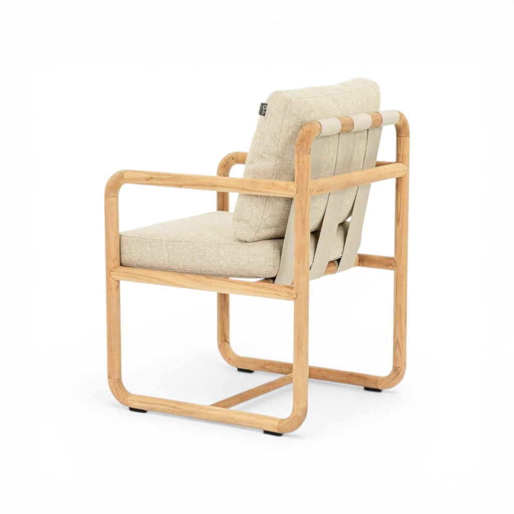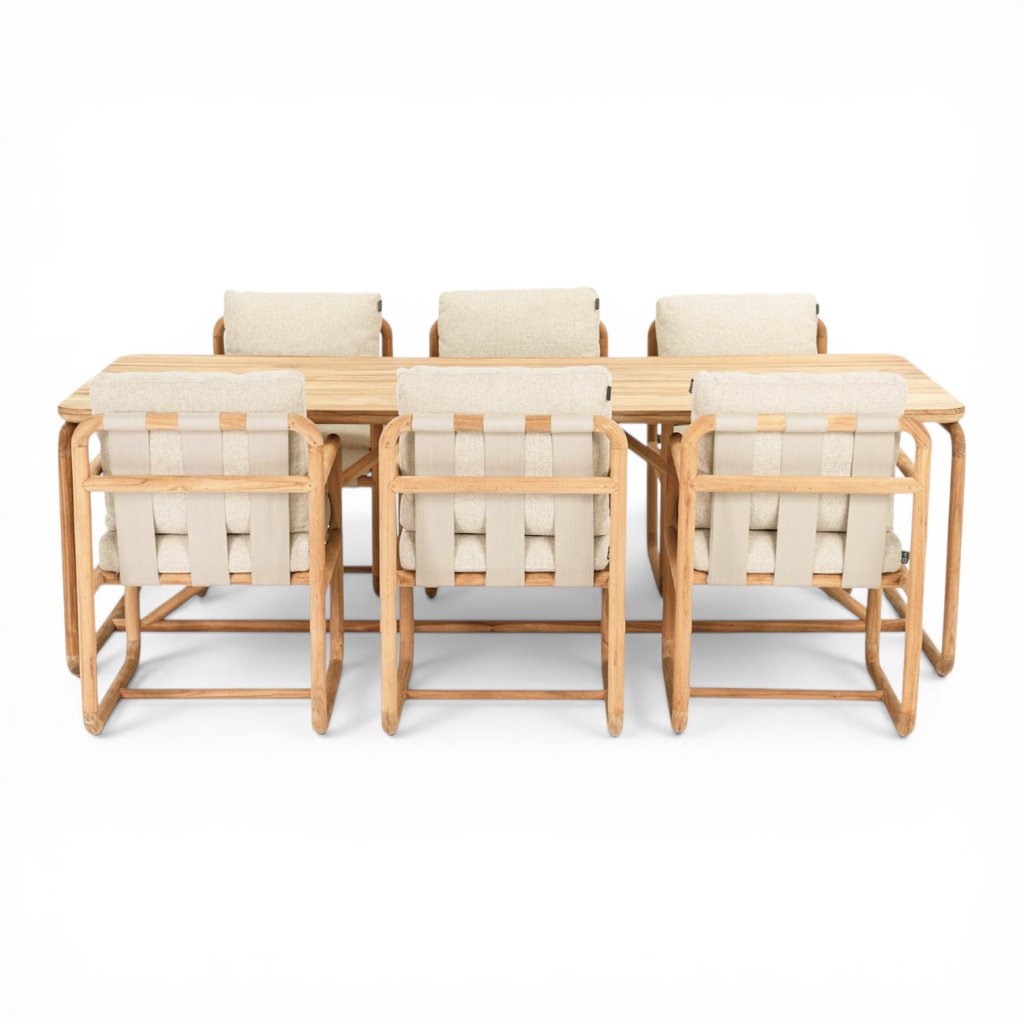 Design stolu vychází z charakteristických prvků kolekce Dolce. Konstrukce z kulatých teakových „tyčí“ v kombinaci s kubistickými tvary a zaoblenými hranami vytváří harmonický a jemný vzhled. Tento detail dodává stolu elegantní, ale zároveň přívětivý charakter, který se snadno kombinuje s dalšími prvky kolekce.