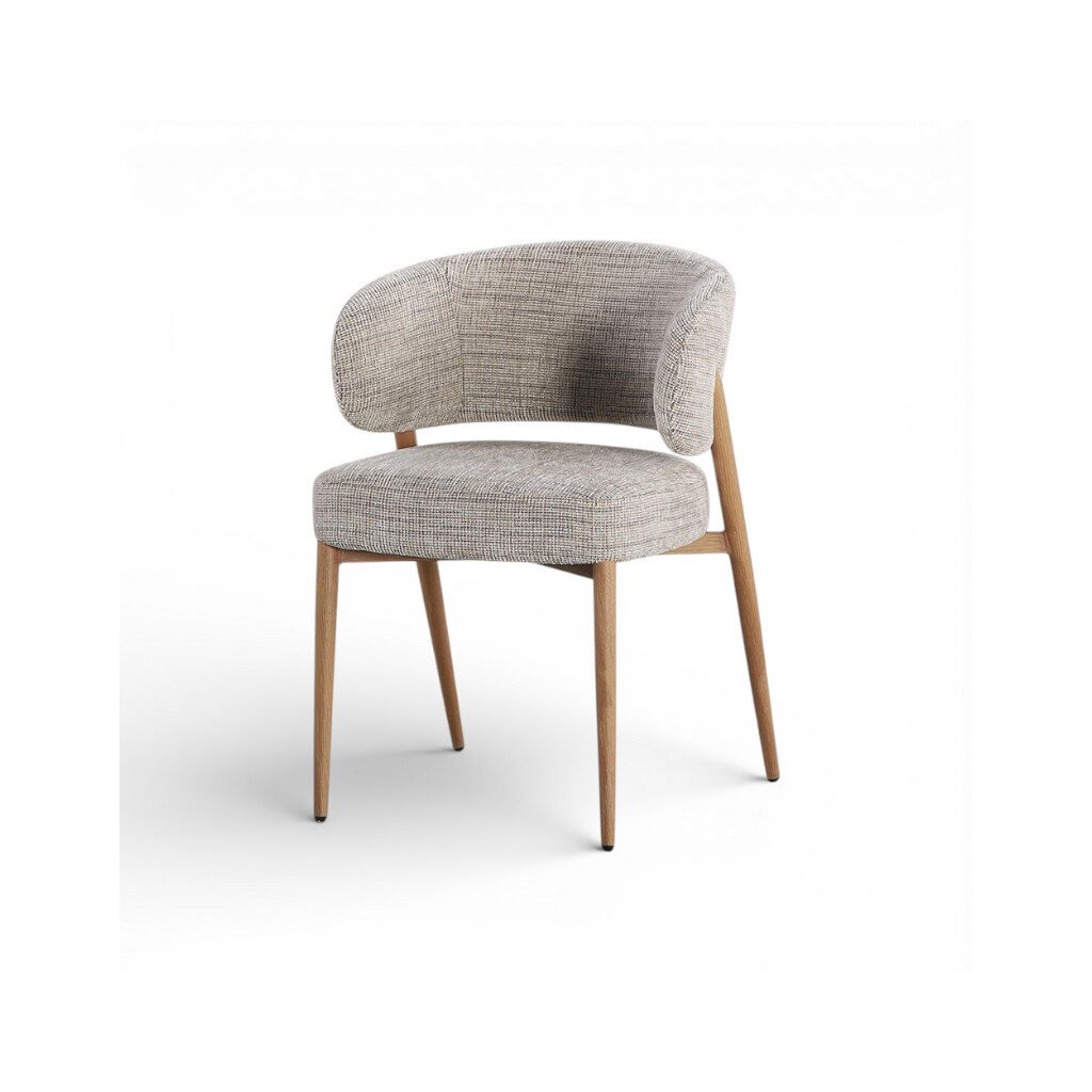 Konstrukce židle je vyrobena z kovu, který zajišťuje vysokou stabilitu a dlouhou životnost. Povrchová úprava v imitaci dekoru dřeva dodává kovové konstrukci přirozený vzhled a dokonale zapadá do filozofie stylu Japandi. Čalounění z kvalitní látky podtrhuje měkký a útulný charakter židle a přispívá k celkovému pohodlí při sezení.