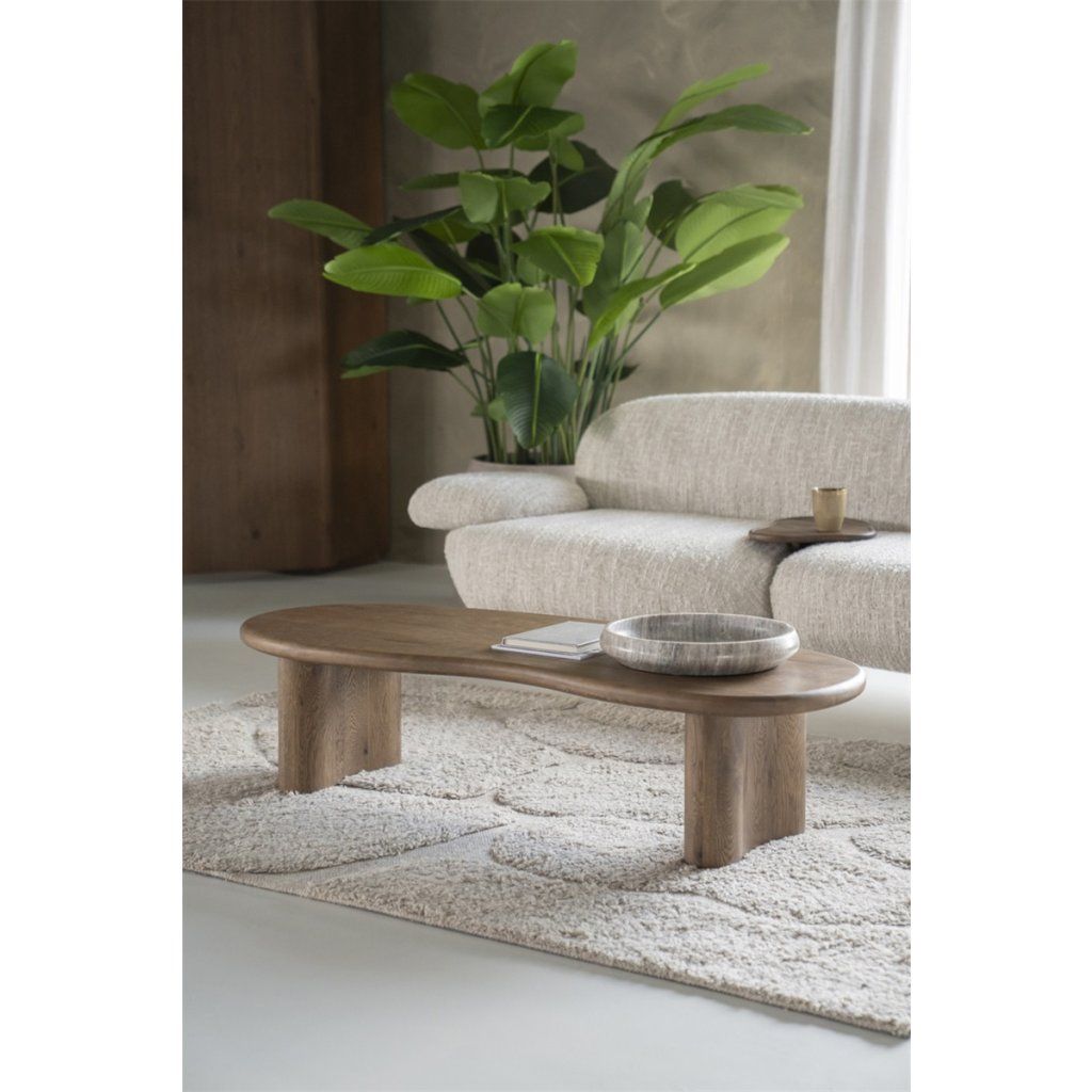 Rozměry 35 × 140 × 60 cm (výška × šířka × hloubka) poskytují dostatek prostoru pro odložení nápojů, knih, dekorací nebo dalších drobností. Díky svému tvaru a proporcím se stolek hodí jak do prostorných obývacích pokojů, tak i do menších interiérů.