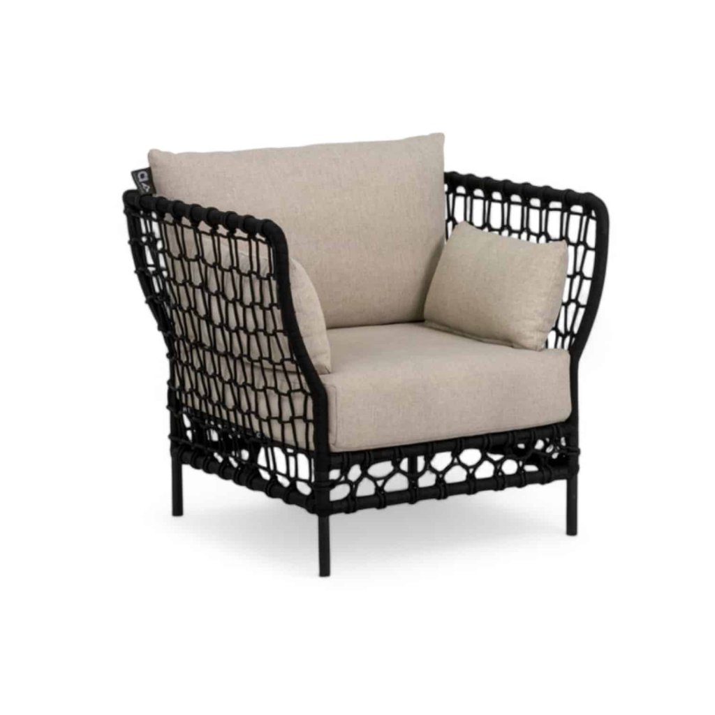 Sedací část tvoří propracované opletení z lan a pásů, které vytváří otevřenou a prodyšnou strukturu. Tento detail nejen zvyšuje komfort při sezení, ale i podtrhuje vizuální lehkost celého designu. Pevné a pružné provedení zajišťuje stabilitu i pohodlí bez nutnosti složité údržby. Opletení působí elegantně, přitom zůstává mimořádně odolné vůči počasí.