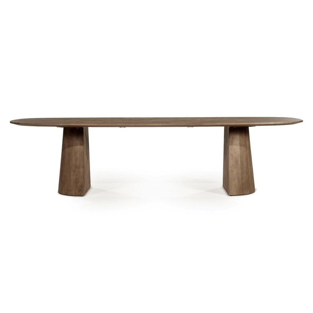 Rozměry 240 × 105 cm poskytují komfortní prostor až pro osm osob, zatímco výška 77 cm zaručuje ideální ergonomii pro každodenní stolování. Oválná deska přispívá k přirozenému toku konverzace a vytváří příjemnou atmosféru při společných chvílích s rodinou i přáteli. Její tvar působí měkce a harmonicky, což z ní činí vítanou alternativu k hranatým modelům.