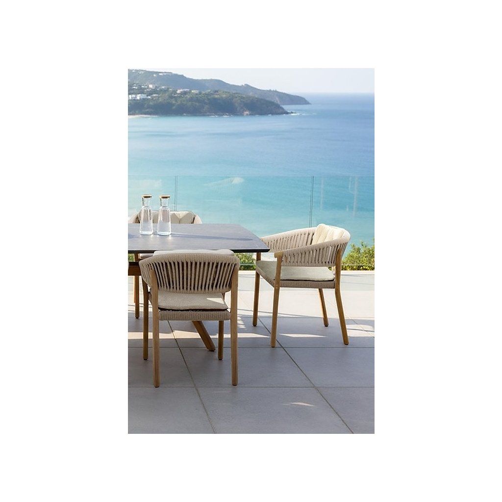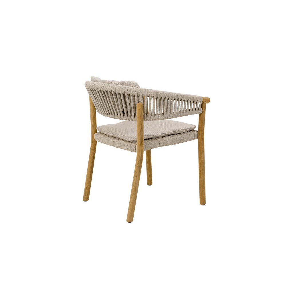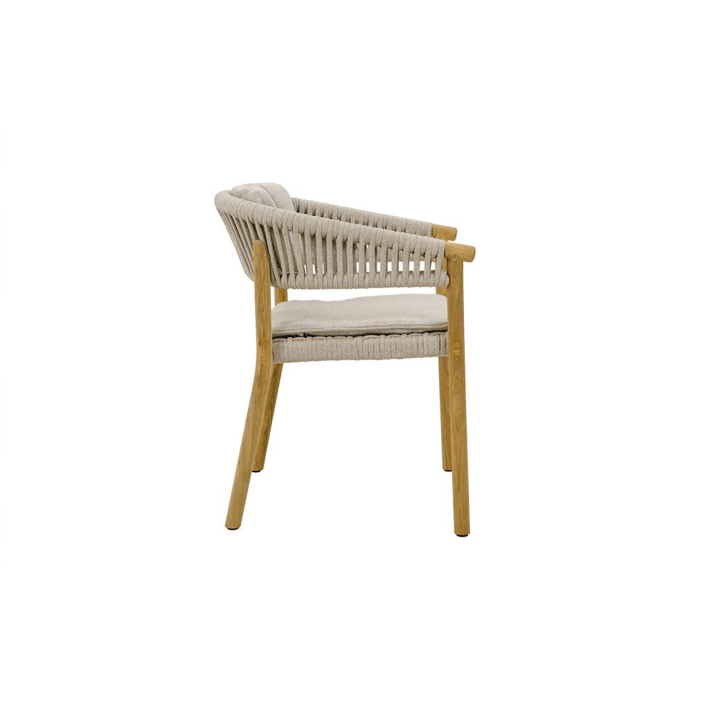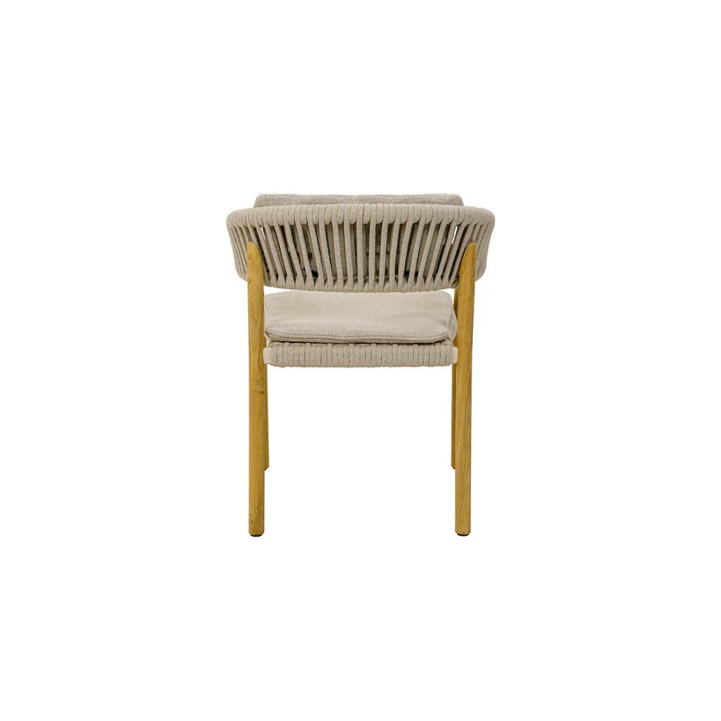 Konstrukce kombinuje masivní teakové dřevo, hliník a výplet z plochého lana (flat rope) v odstínu Linen. Tento materiál dodává židli jemnější a přirozenější vzhled oproti tmavším variantám a skvěle se hodí do světlých a moderních exteriérů. Zároveň je pevný, odolný a vhodný pro dlouhodobé používání.
