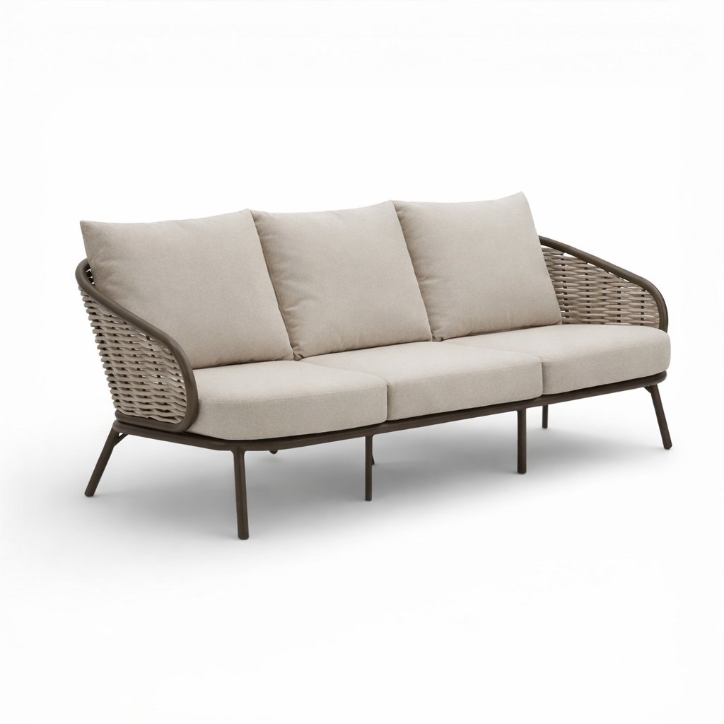 Sofa vás obklopí svými měkkými, zaoblenými liniemi, které působí harmonicky a přirozeně. Trubkový rám v teplém bronzovém odstínu vytváří stylový kontrast ke světlému výpletu Bicular® Wicker v barvě Oyster a polštářům v odstínu Natur-CN. Tato kombinace dodává nábytku luxusní a přitom lehký vzhled, který snadno zapadne do moderních i klasických exteriérů.
