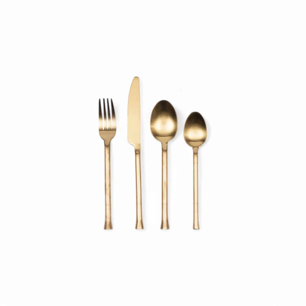Zlatá sada příborů RM vnese do každého stolování noblesu i vkus. Čtyřdílný set v elegantním lesklém provedení zahrnuje vidličku, nůž, lžíci a dezertní lžičku. Každý kousek vyniká harmonickými proporcemi, jemně zaoblenými tvary a příjemnou hmotností, díky čemuž perfektně padne do ruky a usnadní pohodlné stolování.