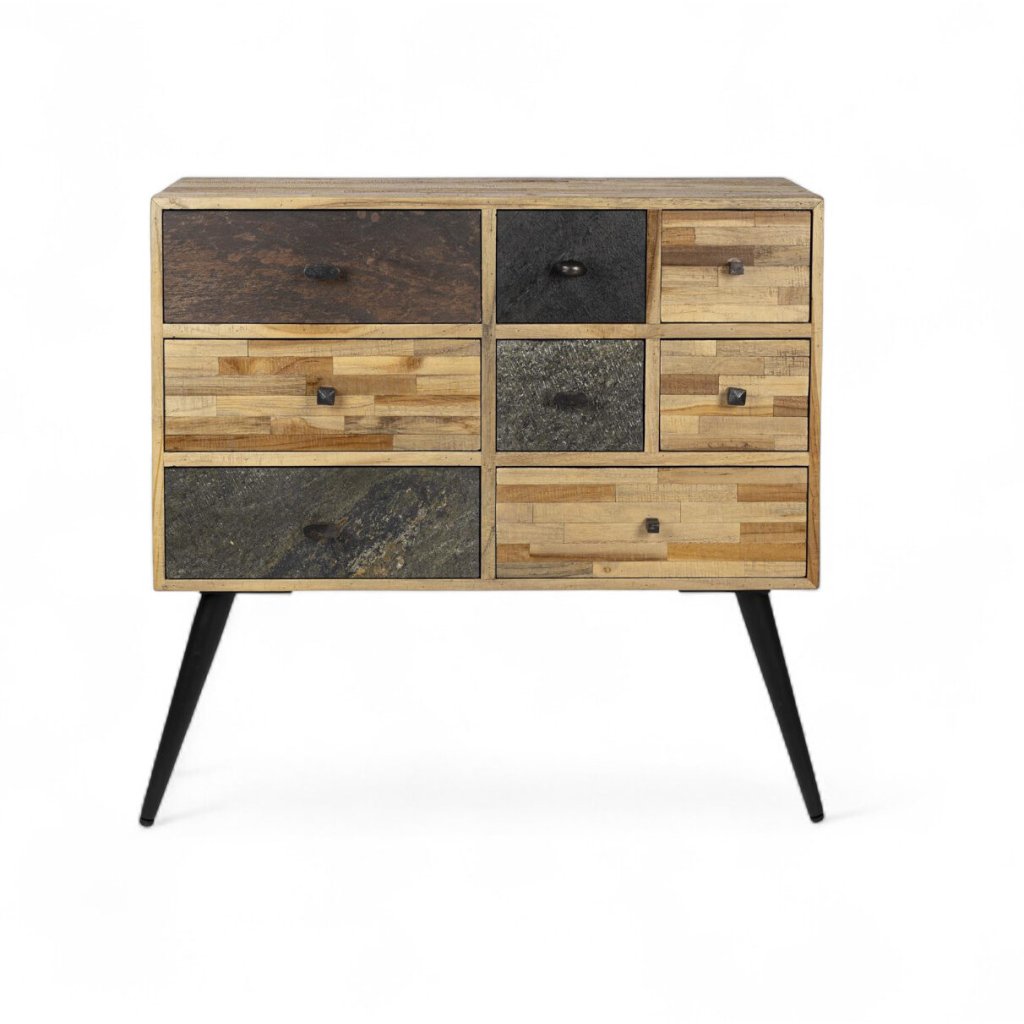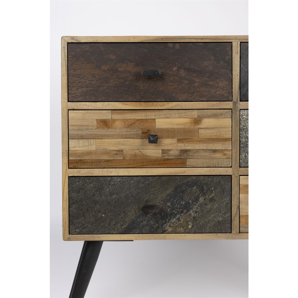 Hlavním materiálem této komody je staré teakové dřevo, které pochází z recyklovaných zdrojů. Díky tomu nese stopy přirozeného stárnutí, včetně jemných barevných rozdílů, nepravidelné kresby a drobných vad, které mu dodávají osobitost a hloubku. Každý kus je originál a nese v sobě jedinečný příběh dřeva, které už mělo svou předchozí funkci.