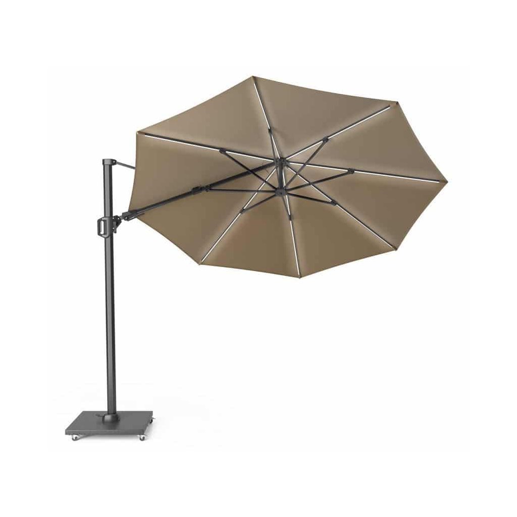 Barevné varianty taupe, antracit a light grey umožňují snadné sladění s nábytkem i okolními dekoracemi. Slunečník navíc doplňuje stabilní podnoží s hmotností 90 kg, vybavené kolečky pro snadné přemístění.