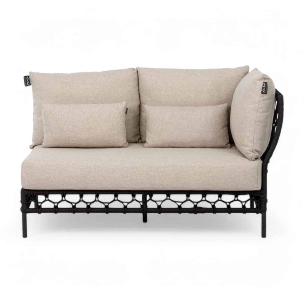 Rám levé části sofy Pure je jemně zakřivený, což podtrhuje plynulost celého designu. Zakřivené linie dodávají sofě jemný, organický vzhled, který harmonicky ladí s moderními i přírodními exteriéry. Design podporuje pocit otevřeného prostoru a zároveň vytváří elegantní solitérní prvek pro terasu, zahradu nebo altán.